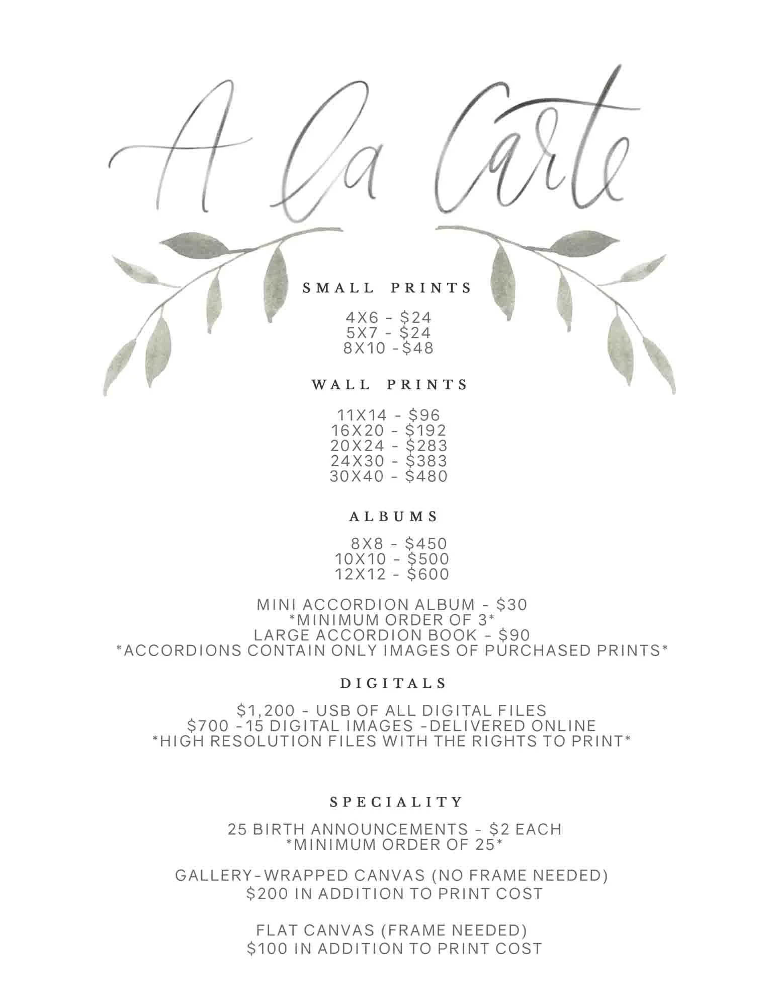 Photographs and artwork are purchased separately during your viewing and ordering appointment, where you’ll select the images and keepsakes that best fit your family and your home. I offer a curated selection of heirloom albums, wall art, and digital collections. This experience is designed to help you invest in photographs you’ll continue to treasure long after this season has passed.
